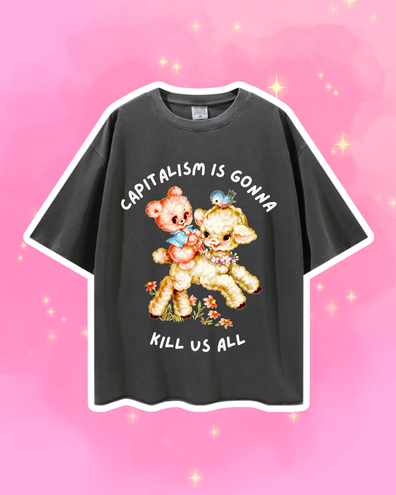 a distressed pigment dyed tee made for getting through it. soft, worn-in and relaxed in all the right ways. nothing fancy. just weird sheep and an anti-capitalist agenda!